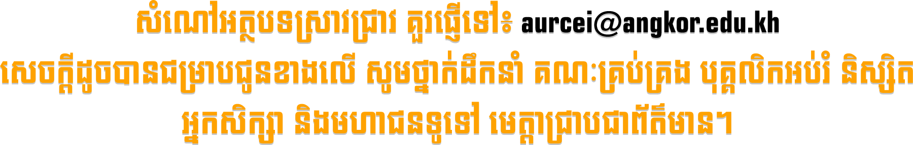 ទស្សនាវដ្តីស្រាវជ្រាវវិទ្យាសាស្រ្ត ស.អ. នៃសហគ្រិនភាព និងនវានុវត្តន៍បៃតង (ទ.ស.ស.អ.ស.ន.ប) របស់សាកលវិទ្យាល័យអង្គរ ត្រូវបានដាក់សម្ពោធឱ្យប្រើប្រាស់ក្នុងខែតុលា ឆ្នាំ២០២៣ ក្រោមអធិបតីភាព លោកសាស្រ្តាចារ្យរងបណ្ឌិត ឈឿត ឃុនលាភ អនុប្រធាននាយកដ្ឋានស្រាវជ្រាវវិទ្យាសាស្រ្ត។ ទ.ស.ស.អ.ស.ន.ប ទទួលបោះពុម្ពអត្ថបទស្រាវជ្រាវជាភាសាខ្មែរដែលតម្រូវឱ្យរៀបចំមូលន័យសង្ខេបនិងពាក្យគន្លឹះជាភាសាអង់គ្លេស និងអត្ថបទស្រាវជ្រាវជាភាសាអង់គ្លេសតម្រូវឱ្យរៀបចំមូលន័យសង្ខេបនិងពាក្យគន្លឹះជាភាសាខ្មែរ។ ប្រធានបទបោះពុម្ពត្រូវពាក់ព័ន្ធទៅនឹងវិស័យដែលមានការបណ្តុះបណ្តាលនៅក្នុងមហាវិទ្យាល័យដូចខាងក្រោម ៖